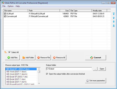 Okdo Pdf to All Converter Professional là phần mềm chuyển đổi file PDF sang các định dạng khác rất mạnh mẽ và chuyên nghiệp. Với phần mềm này, bạn có thể chuyển đổi theo nhóm các file PDF sang định dạng doc, docx, docm, xls, xlsx, xlsm, rtf, ppt, pptx, pptm, txt, htm, pdf, jpeg, jpg, bmp, gif, tif, png, emf, wmf, ico, jp2, j2k, pcx, rle, tga, swf video,…. Rất dễ để sử dụng phần mềm này, bạn chỉ cần thêm file muốn chuyển đổi vào danh sách rồi kích vào nút “Convert” là xong. Chất lượng của file đầu ra rất tốt cũng như tốc độ thực hiện chuyển đổi siêu nhanh. Bên cạnh đó, phần mềm này còn giúp giữ nguyên cấu trúc, ảnh, văn bản gốc của file PDF.